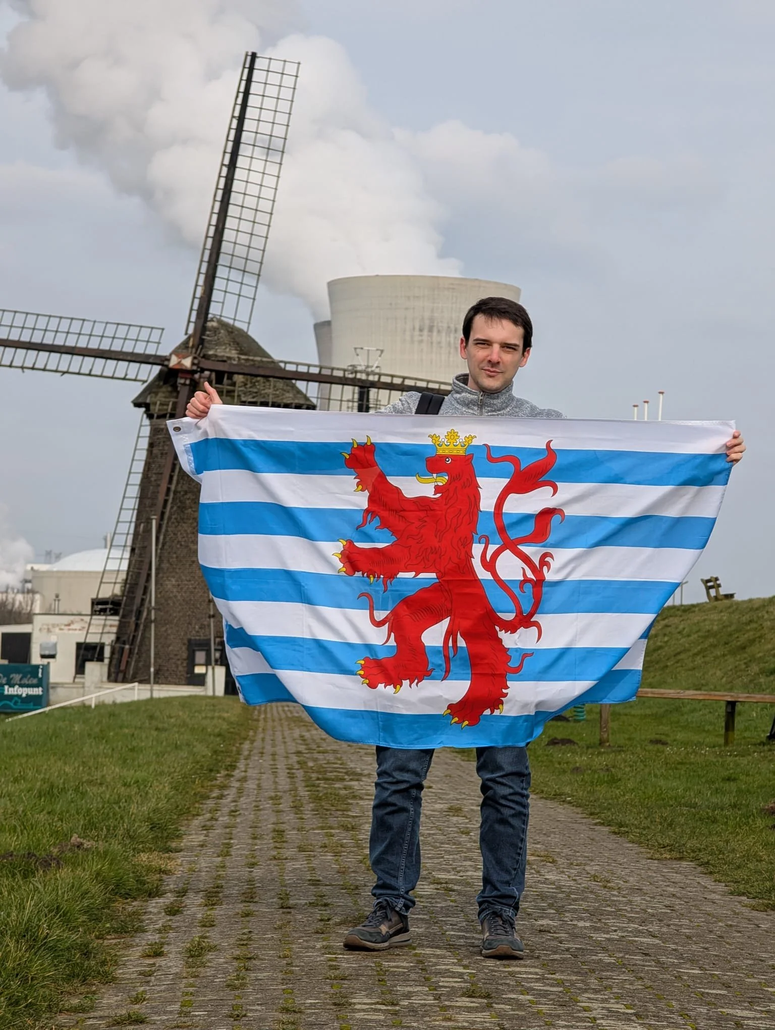 Ptak, hoisting the Luxembourg civil flag for a pro-nuclear demonstration at Doel Nuclear Plant.